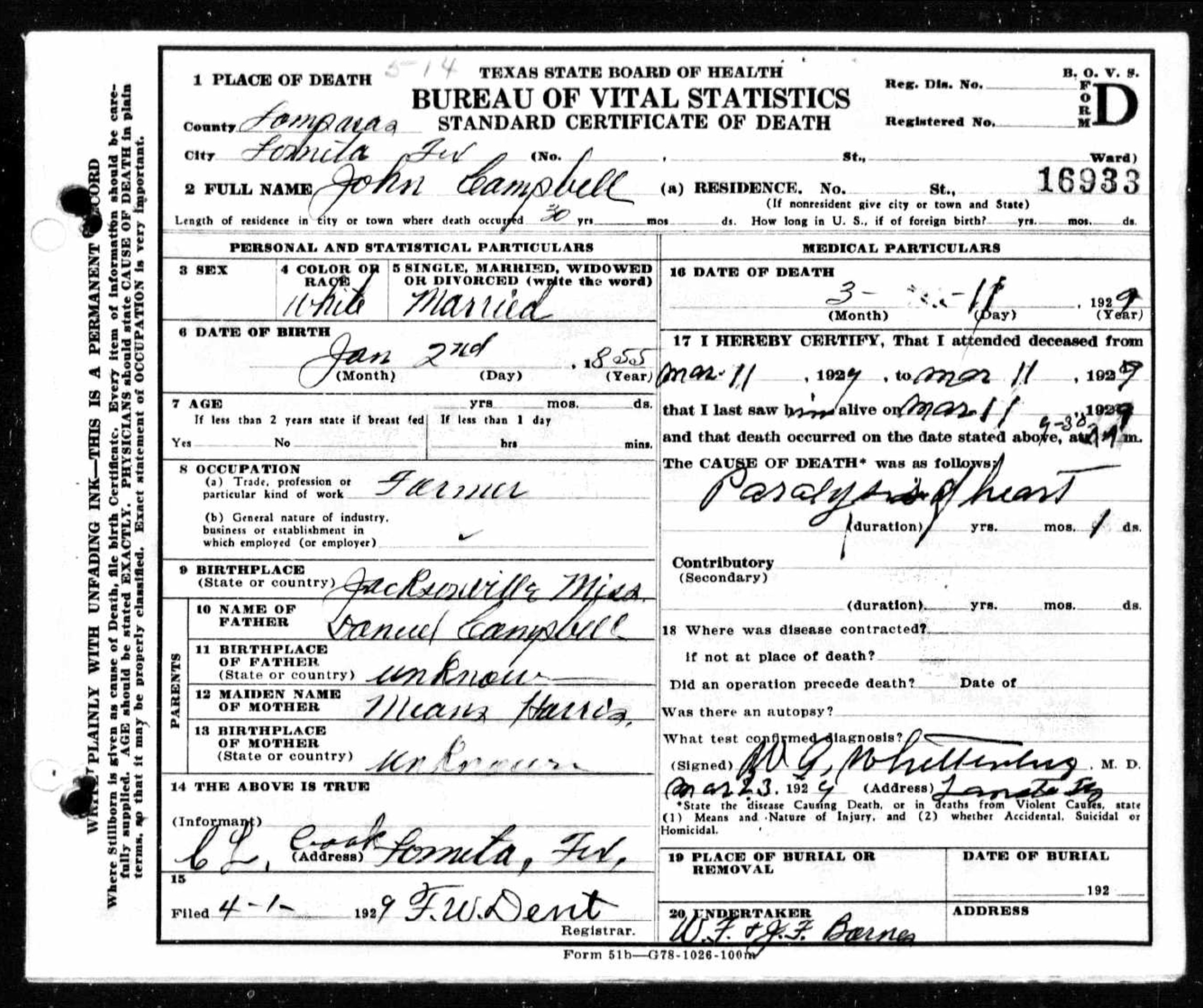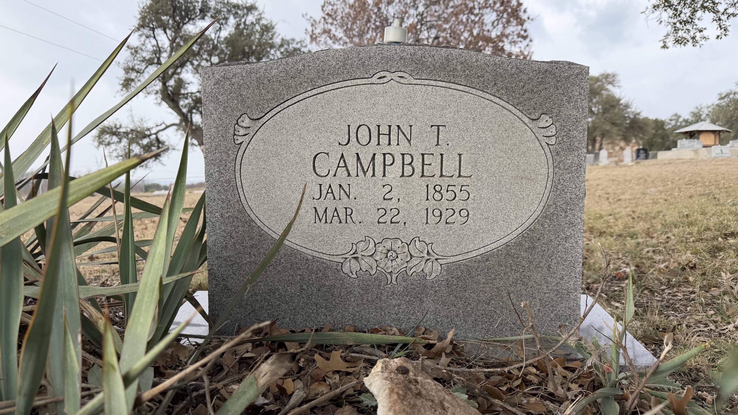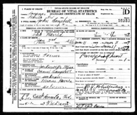 John was born in Jacksonville, Mississippi, to Daniel Archibald Campbell (1827-1902) and Sylvia Elizabeth [Parker] Campbell (1838-1915). In 1860, he was living in Sarepta, Mississippi and by 1870 had moved to Dallas, Lafayette County, Mississippi. By 1880, he and his family were living in Coryell County, Texas. He married Millie A. Temple on July 22, 1894, in Lampasas, Texas. He and his family were likely living in Lometa, Texas, by 1910, where he died on March 11, 1929, from paralysis of the heart. Death date on tombstone does not match death date on death certificate.