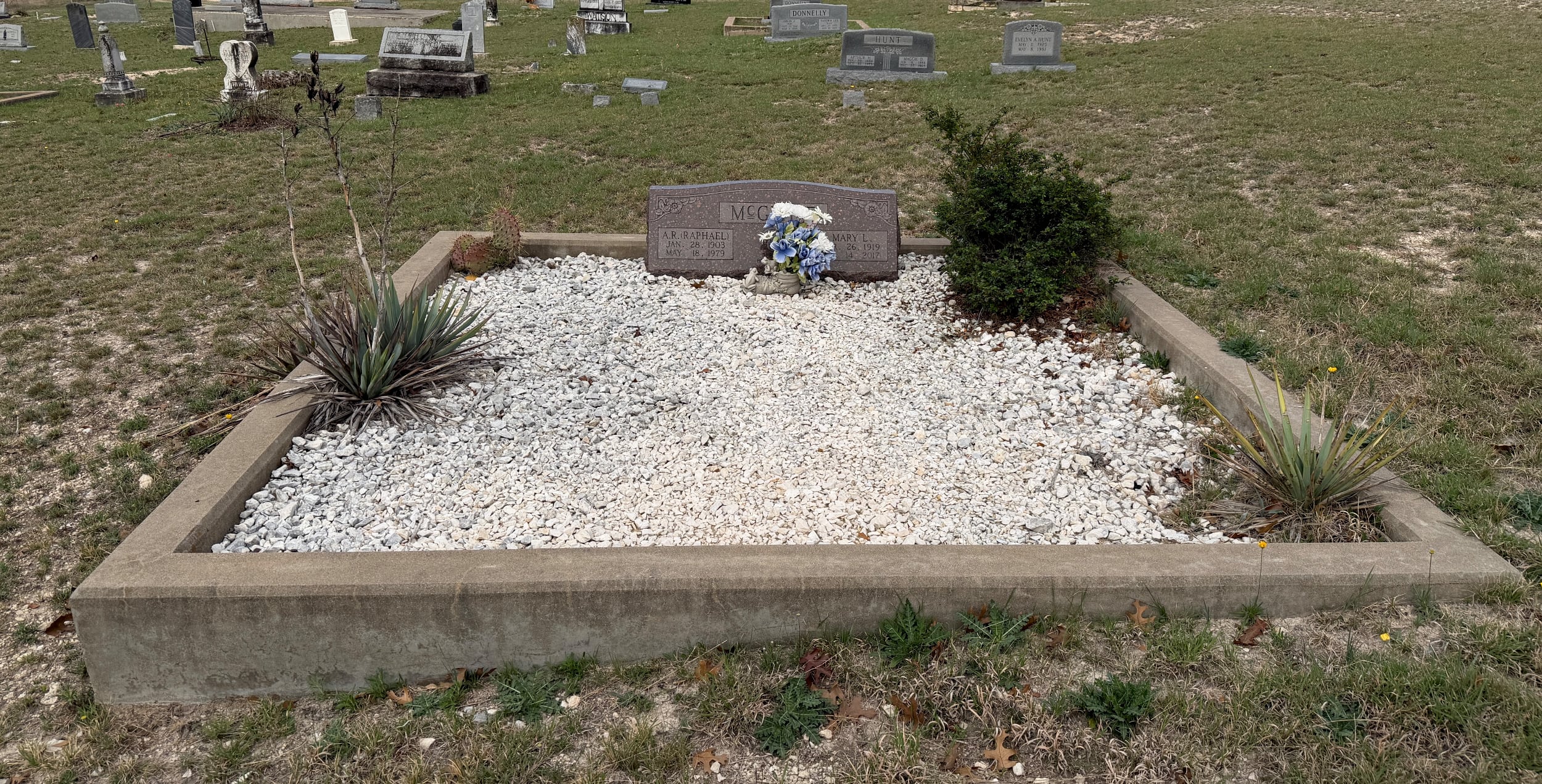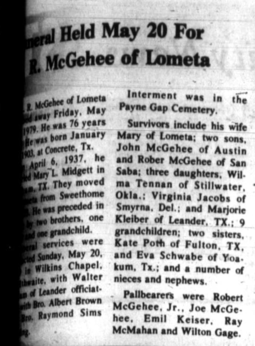 A.R. was born to Robert Wadkins Wadsworth McGehee (1862-1939) and Lula Eve Elizabeth Ammann (1867-1957) on January 28, 1903, in Concrete, DeWitt County, Texas. He married Mary Louise Midgett on April 6, 1937, in Yokum, Texas. The couple moved to Lometa from Sweet Home in 1958. They had five children: John Raphael MGehee, Roger Neil McGehee, Wilma Lou Holbrook, Opal Virginia Jacobs, and Marjorie Nell Kleiber. A.R. was a farmer and rancher in rural Lometa and was living there at the time of his death. He Died at the San Saba Hospital, San Saba, Texas.